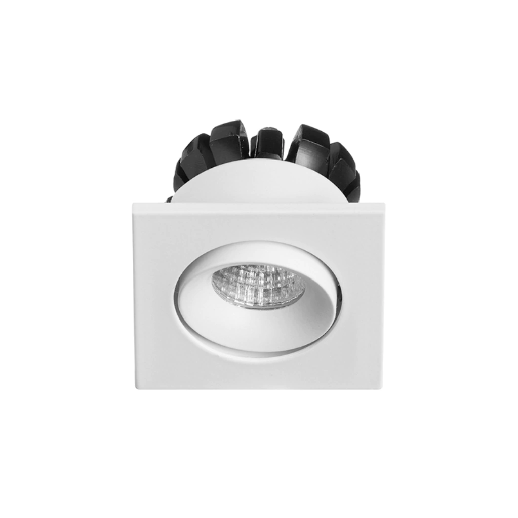 - Mini embutido de techo cuadrado, pequeño y de simple instalación. Cabezal con movimiento cardánico. Distribución de luz simétrica-directa.