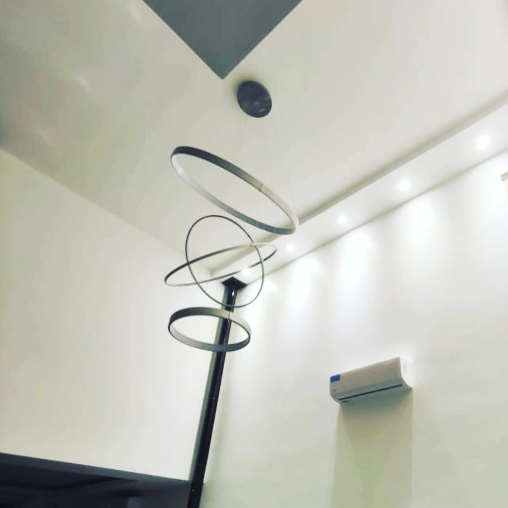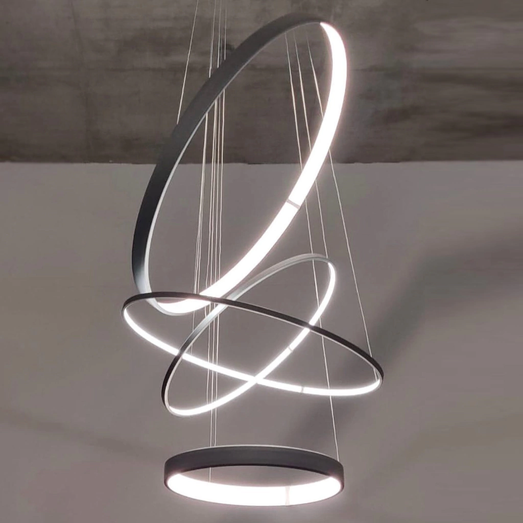 - Colgante formado por aros de LED finos y gruesos, de aluminio con luz interna LED.
