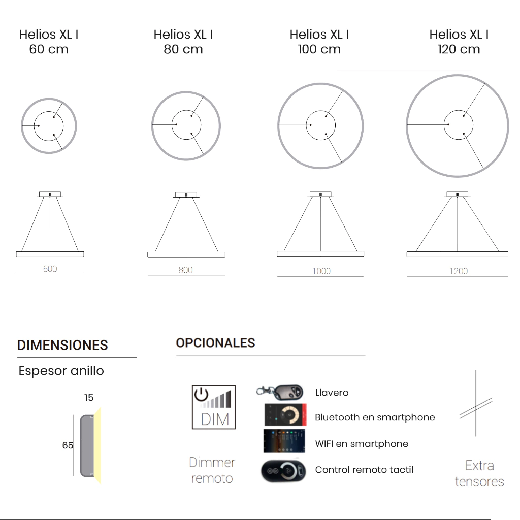 - Variantes: 1 aro de 60cm (LED 68W) / 1 aro de 80cm (LED 90W) / 1 aro de 100cm (LED 108W) / 1 aro de 120cm (LED 130W) / 1 aro de 150cm (LED 176W)