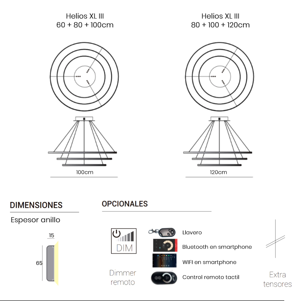 - Variantes: 3 aros de 60cm + 80cm + 100cm (260W) / 3 aros de 80cm + 100cm + 120cm (330W).
